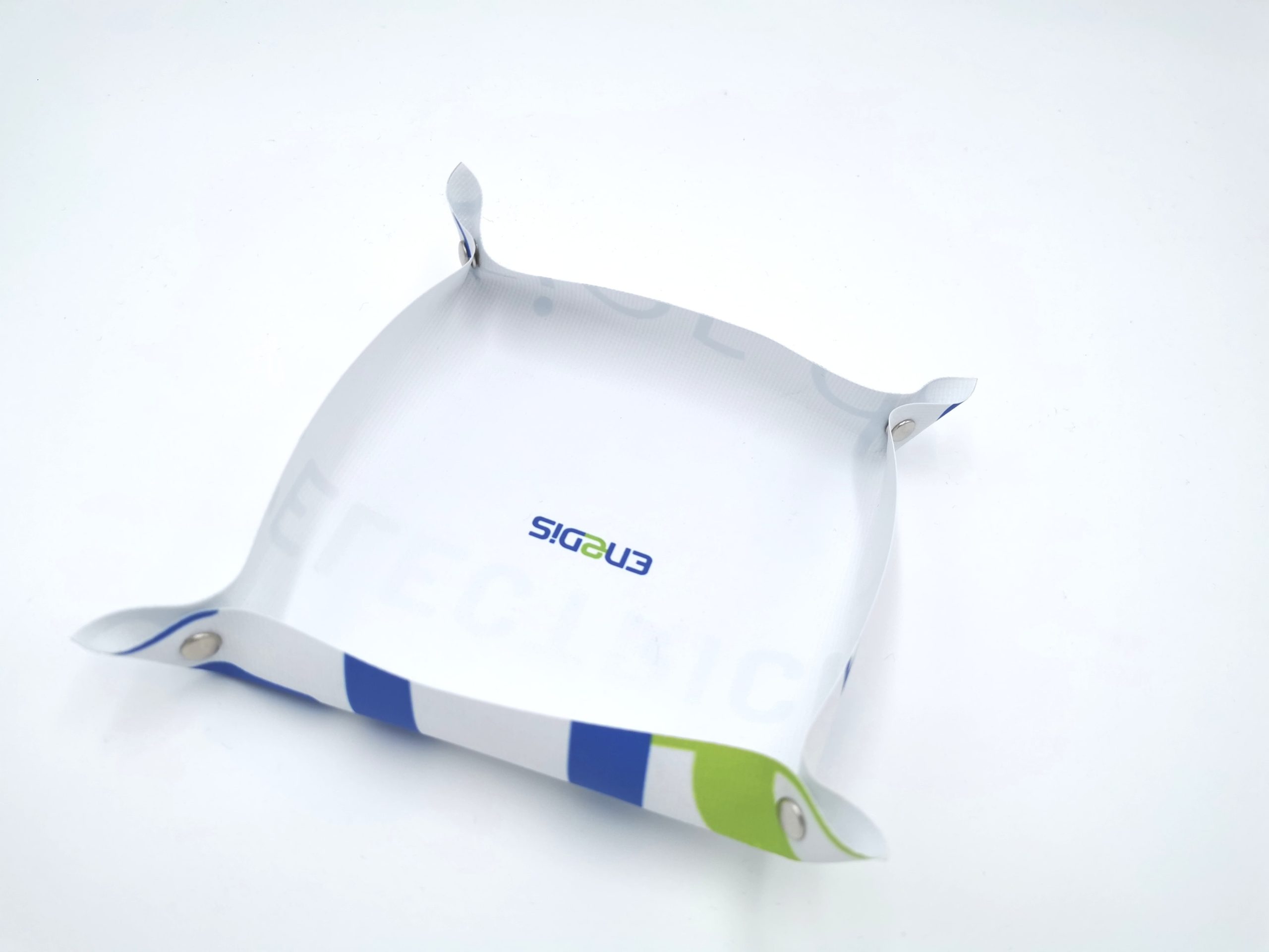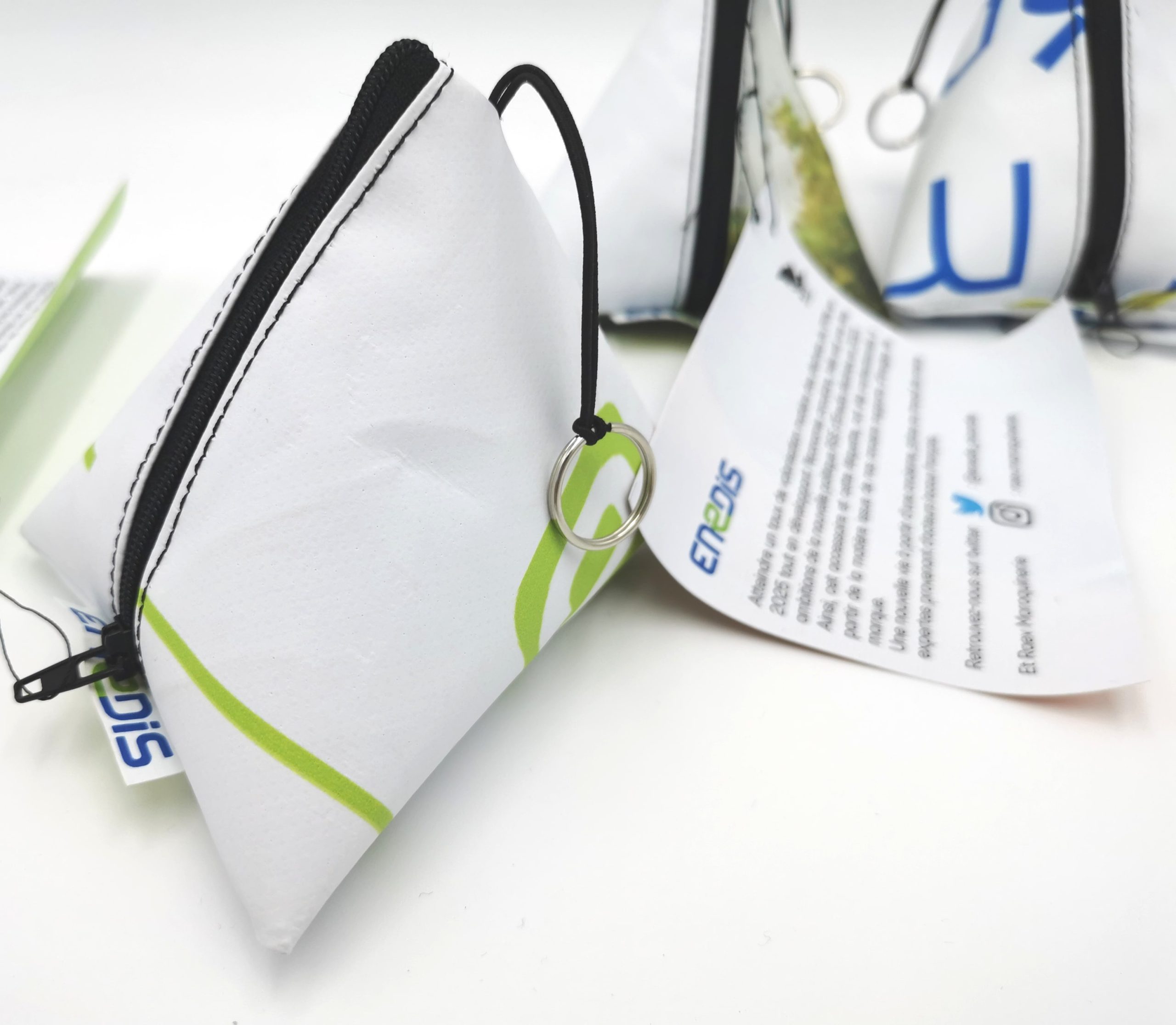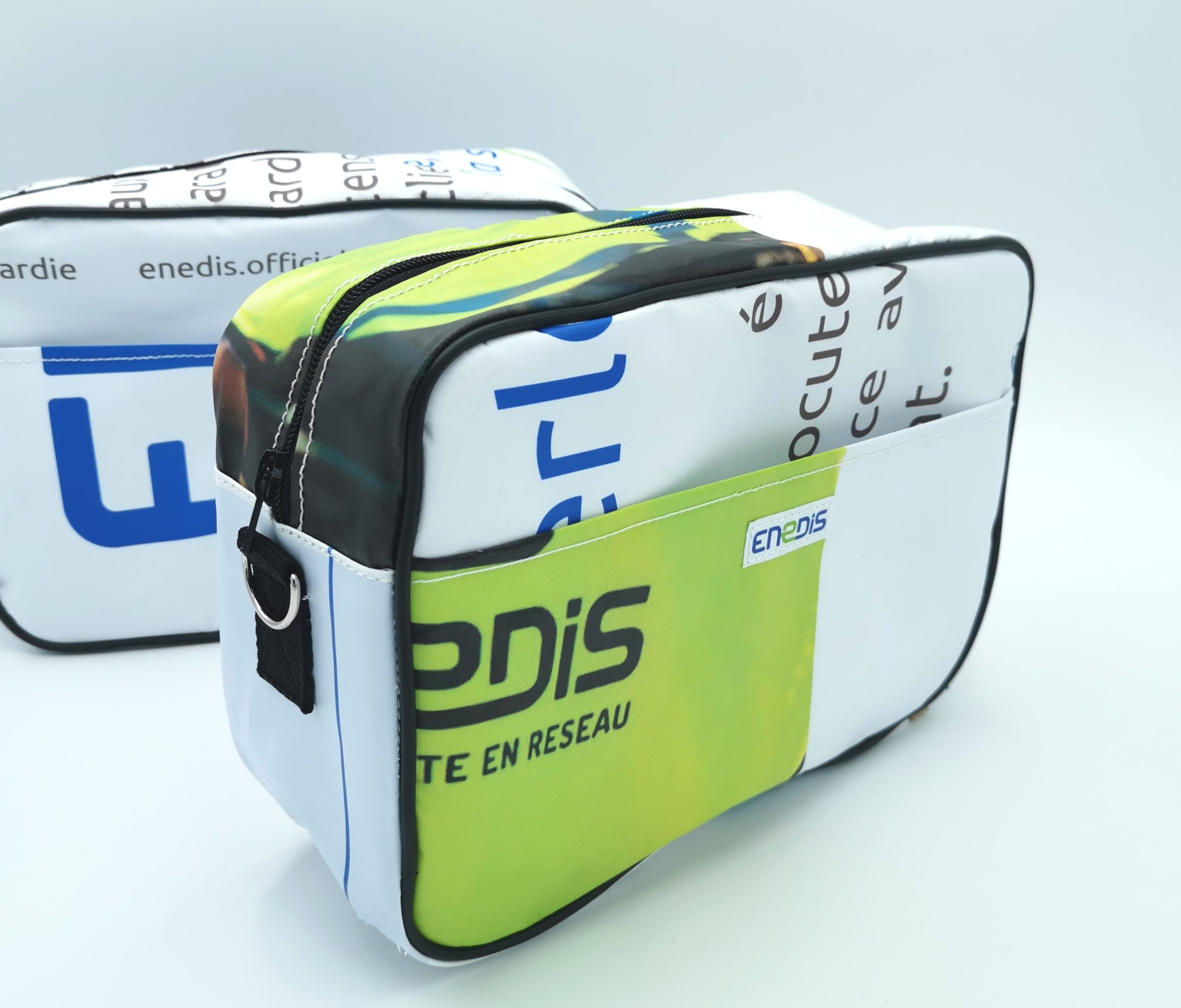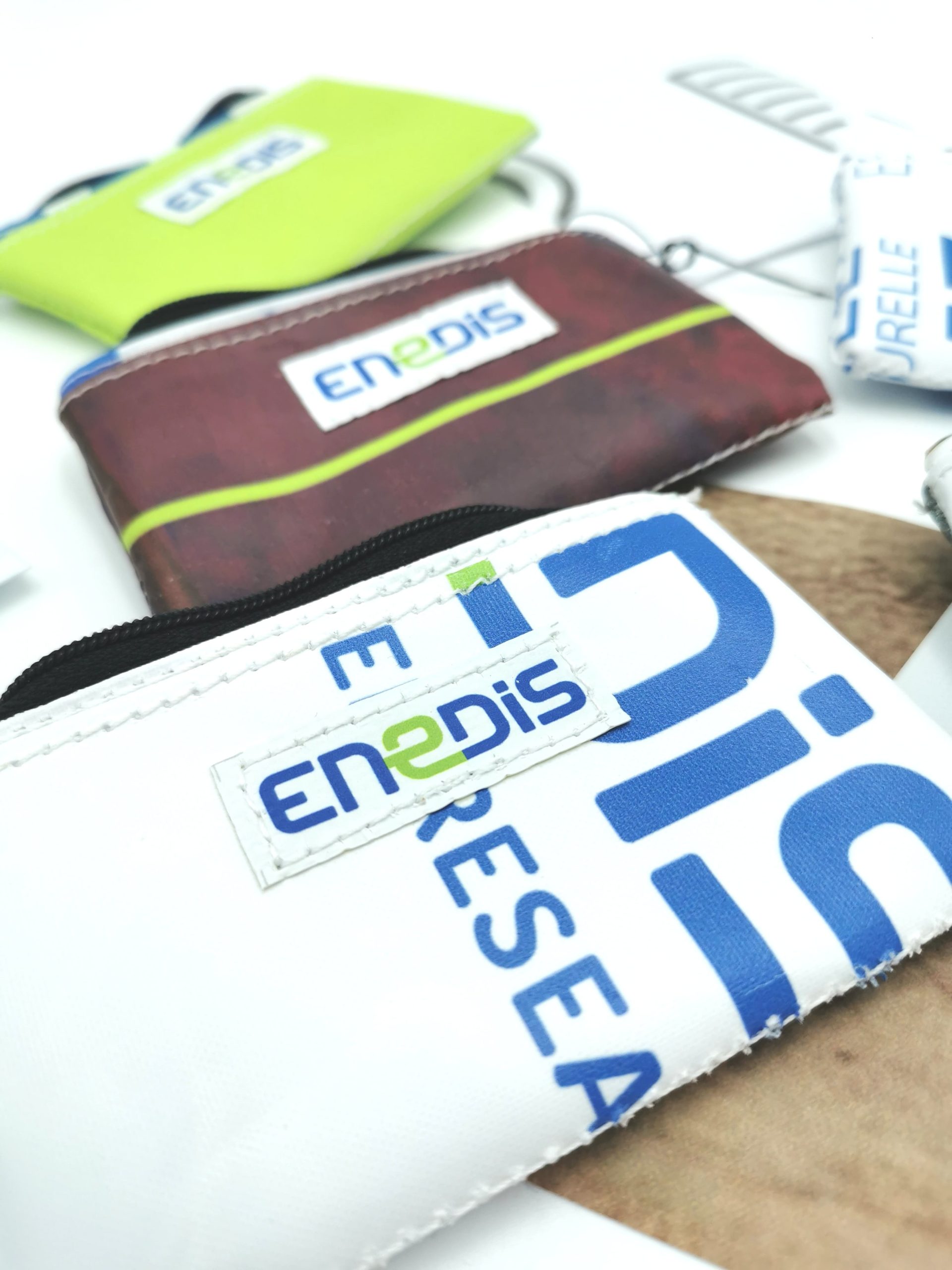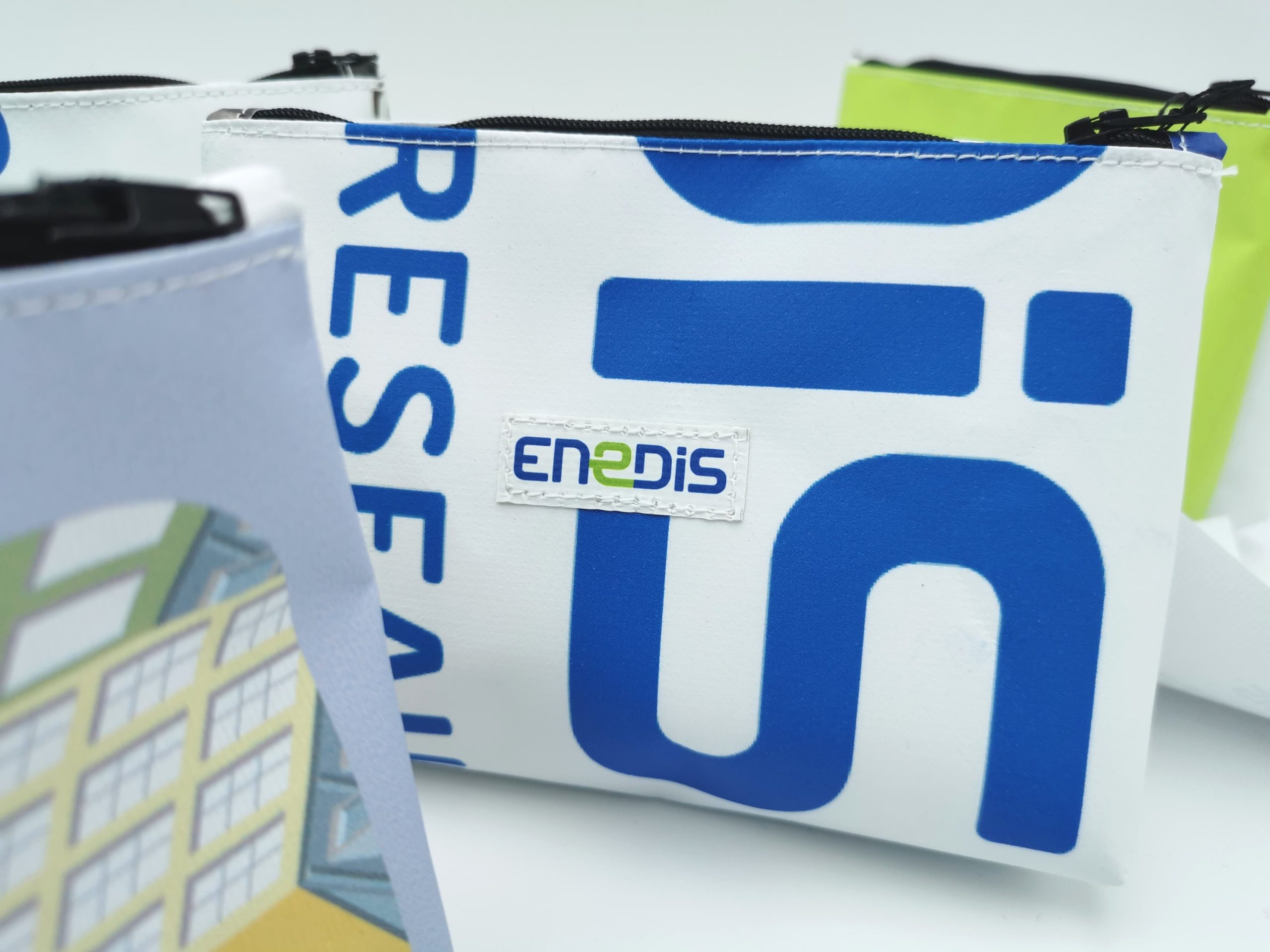 Chaque objet intègre une étiquette externe portant le logo d’ENEDIS. Des étiquettes supplémentaires, imprimées sur des morceaux de bâches non utilisables pour la fabrication, relatent l’histoire du projet et la démarche RSE du client. Une personnalisation conçue pour donner du sens tout en renforçant la cohérence écologique du projet.