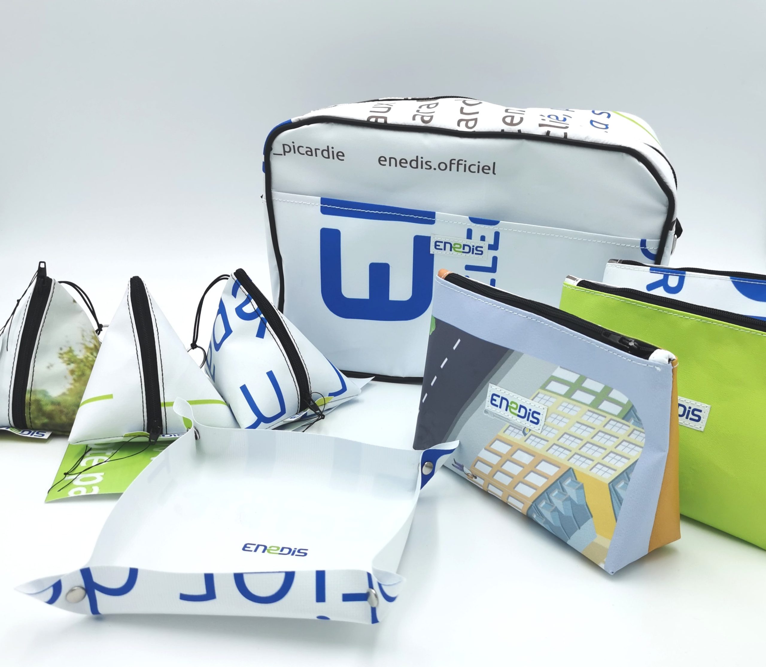 Pour ENEDIS, j’ai conçu 630 goodies écoresponsables à partir de leurs kakémonos, roll-up et bâches. Cinq modèles ont été créés et personnalisés, avec 93 % de matière revalorisée. Un projet mêlant upcycling, communication responsable et forte dimension sociale, au service des salariés de la DR Picardie.