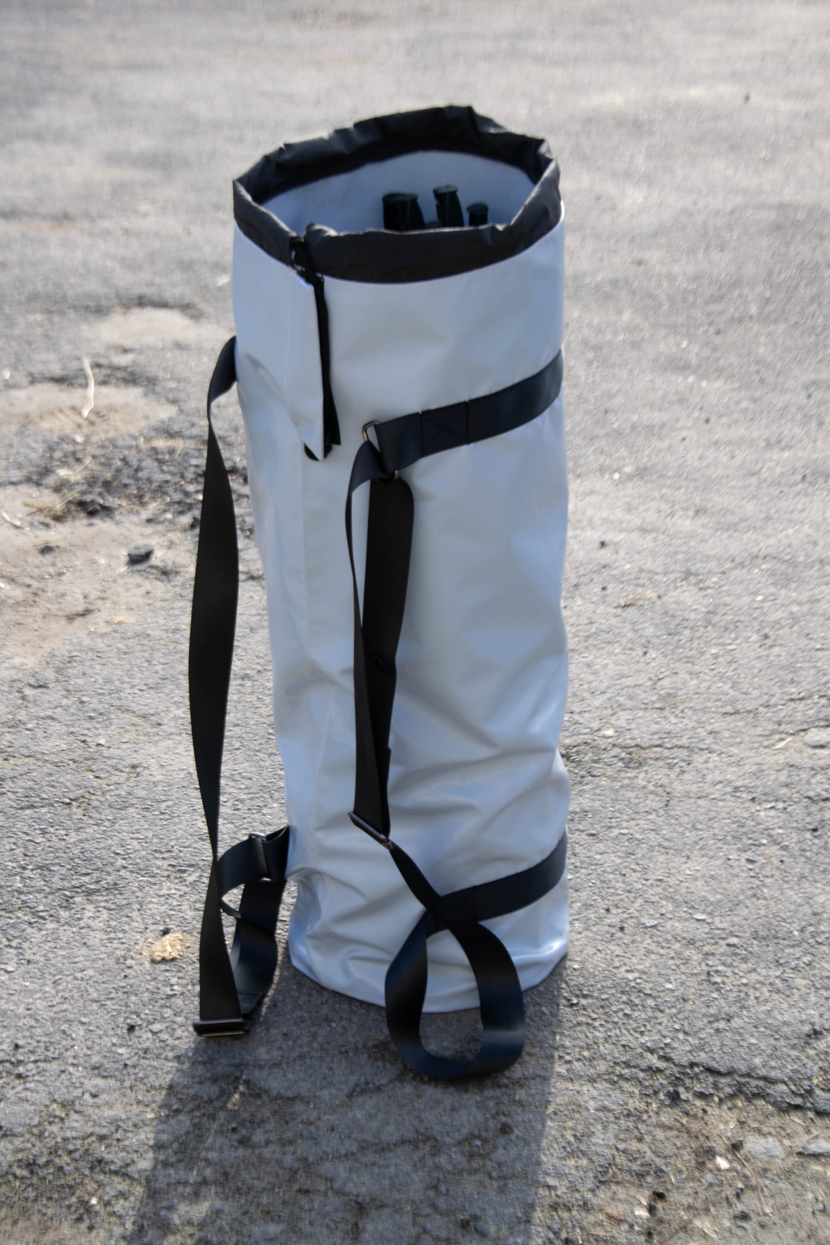 Un cahier des charges précis a été construit à partir des prototypes et échanges avec le client. La sacoche devait permettre : un portage facilité des piquets (jusqu’à 50), une utilisation en bandoulière ou sur le dos, une bonne maniabilité grâce aux sangles et poignées, un rangement simple dans la camionnette. La matière choisie : bâche de camion upcyclée, robuste et écoresponsable, répondant aux valeurs communes des deux entreprises.